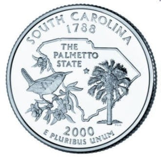Depicts the key state symbols- a Palmetto Tree, the Carolina Wren and