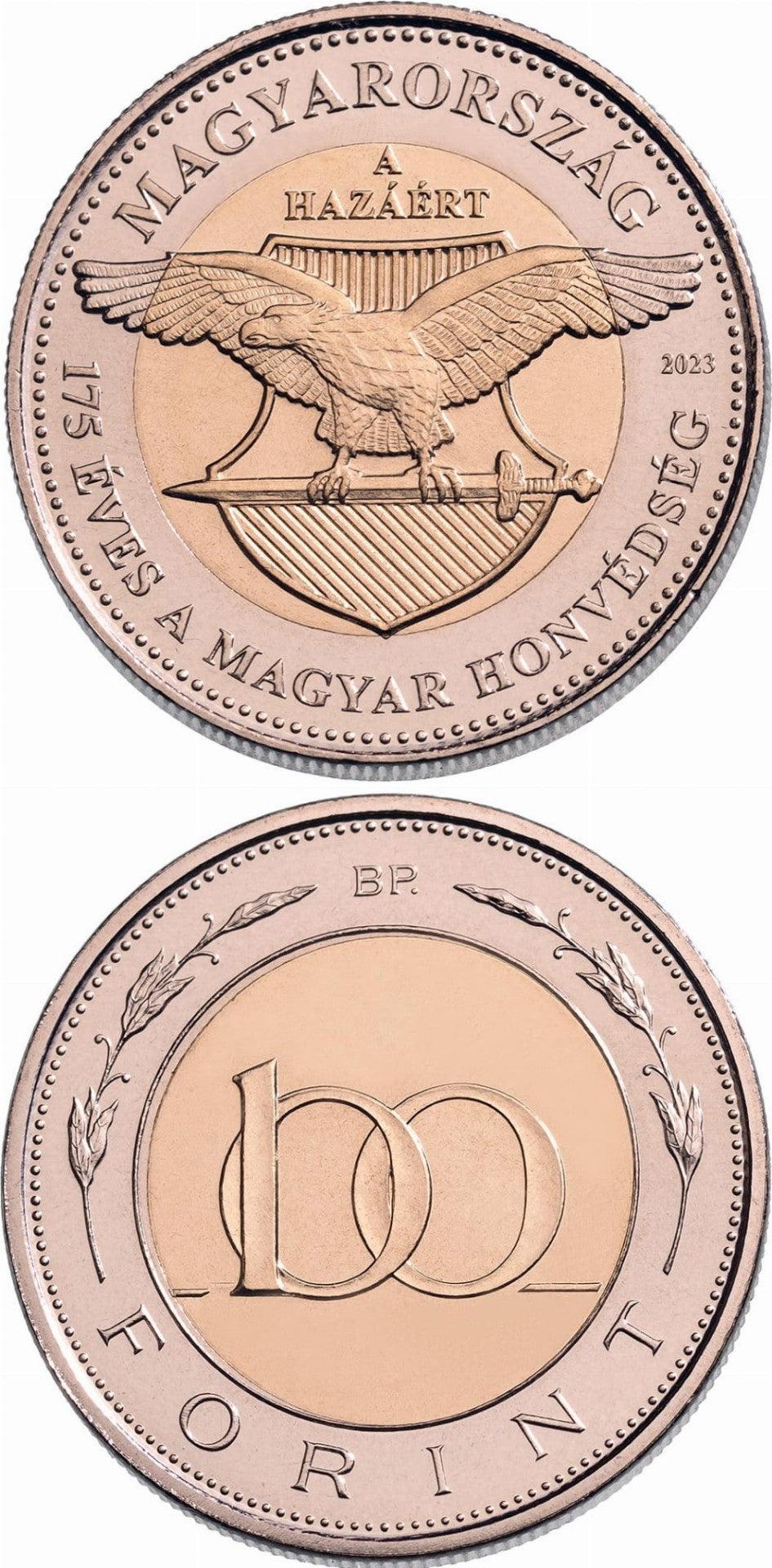 Awers: Na pierścieniu, wzdłuż krawędzi, ozdobne perły. U góry nazwa państwa: MAGYARORSZÁG. Po prawej rok emisji: 2023. U dołu napis okolicznościowy: 175 ÉVES A MAGYAR HONVÉDSÉG (175. lat Węgierskich Sił Obronnych); Na krążku godło formacji z mottem: A / HAZÁÉRT (Za ojczyznę)