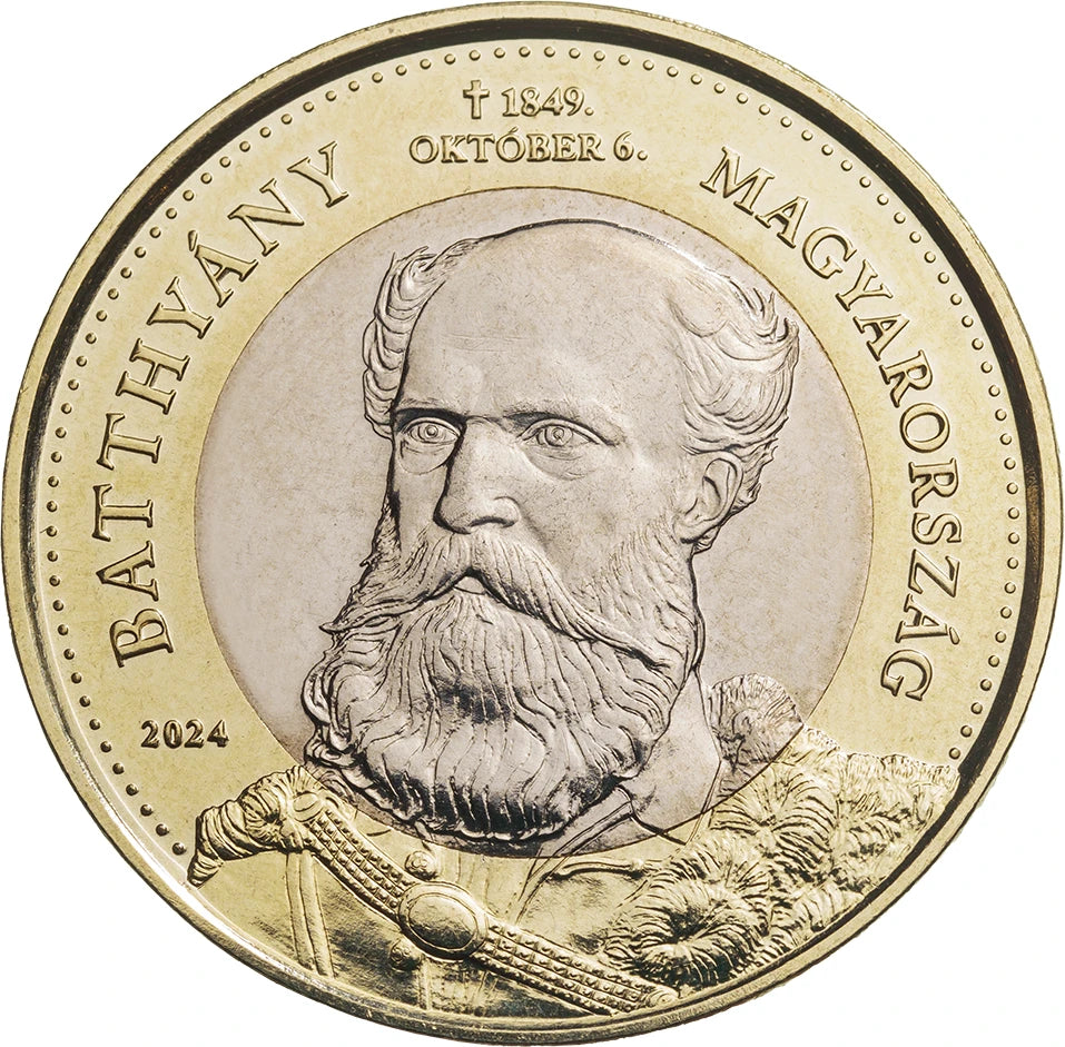 Awers: Na pierścieniu wzdłuż krawędzi ozdobne perły. U góry napis: ✞ 1849. / OKTÓBER 6. (data egzekucji: 6 października 1849 r.). Z lewej, półkolem, napis: BATTHYÁNY. Z prawej, półkolem, nazwa państwa: MAGYARORSZÁG. Pod nazwiskiem rok emisji: 2024. Centralnie, na krążku i pierścieniu, popiersie Lajosa Batthyány’ego, inspirowane obrazem Lajos Batthyány pędzla Miklósa Barabása (1840)