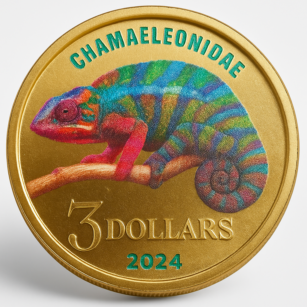 Poprzedni przesłany rewers (z kameleonem i napisem "CHAMAELEONIDAE", nominał 3 DOLLARS, rok 2024) stanowi rewers tej serii monet. Ukazuje barwnego kameleona lamparciego (Furcifer pardalis) siedzącego na gałęzi. Nazwa rodziny zwierzęcej „CHAMAELEONIDAE” umieszczona jest łukiem u góry, a na dole widnieje nominał "3 DOLLARS" oraz rok emisji 2024.